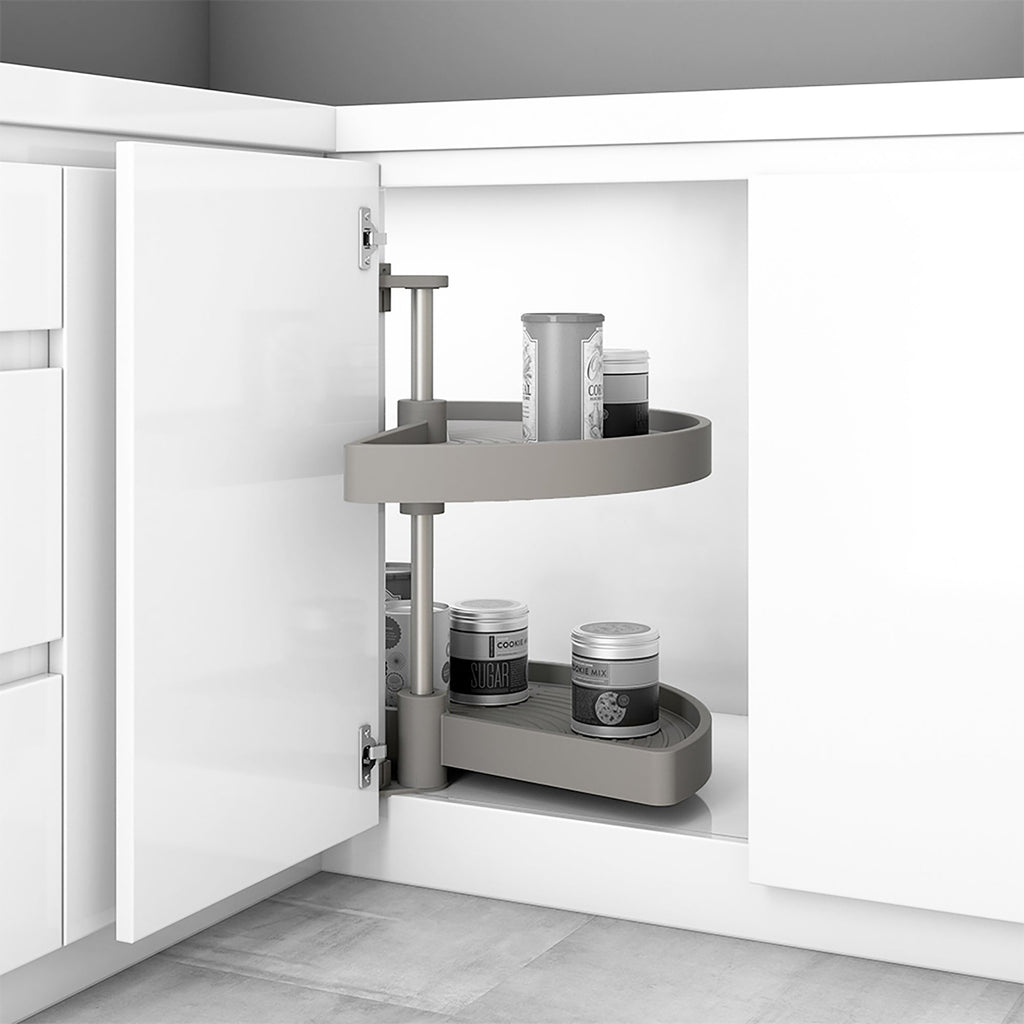 Cestelli girevoli mezza luna progettati per ottimizzare lo spazio in moduli ad angolo di cucina a forma di L. Sono facili da installare e adattabili a diverse altezze dei moduli. Sono disponibili per misure di moduli da 800 mm e 900 mm e finiture bianche e grigie . Il sistema è composto da 2 vassoi e accessori di montaggio in plastica riciclabile, antistatico, ad alta resistenza agli urti e ai raggi ultravioletti e una barra centrale in alluminio anodizzato opaco. Hanno una capacità di carico di 20 kg per vassoio .