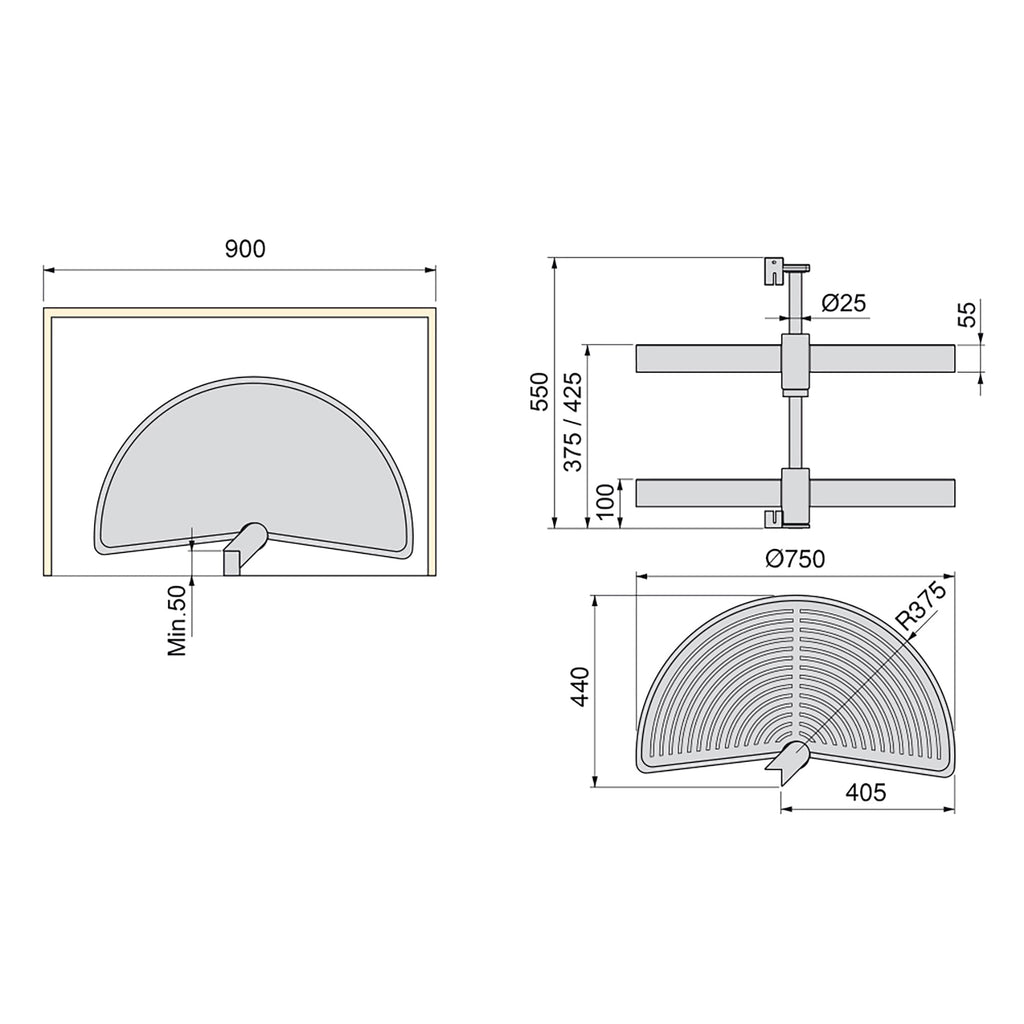 Cestelli girevoli mezza luna progettati per ottimizzare lo spazio in moduli ad angolo di cucina a forma di L. Sono facili da installare e adattabili a diverse altezze dei moduli. Sono disponibili per misure di moduli da 800 mm e 900 mm e finiture bianche e grigie . Il sistema è composto da 2 vassoi e accessori di montaggio in plastica riciclabile, antistatico, ad alta resistenza agli urti e ai raggi ultravioletti e una barra centrale in alluminio anodizzato opaco. Hanno una capacità di carico di 20 kg per vassoio .