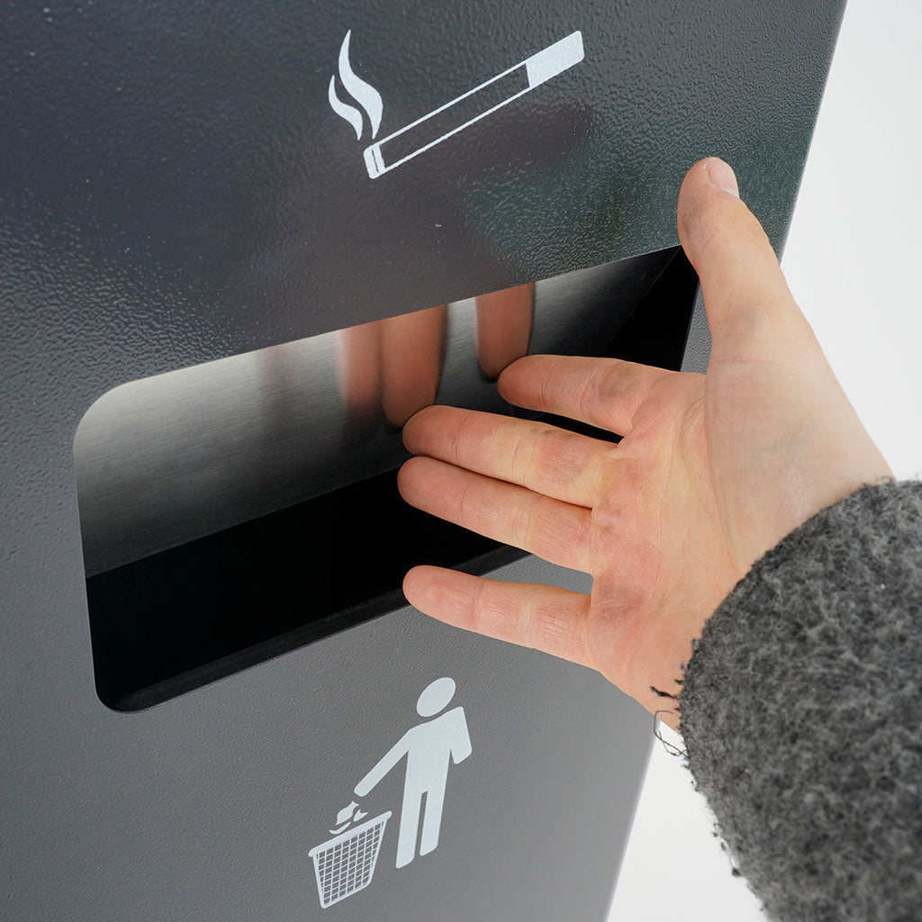 Il bidone con posacenere da esterno è perfetto per un uso all'aperto. La sua copertura superiore protegge il cestino dalla pioggia e dalle intemperie, garantendo la massima durabilità nel tempo. Il posacenere è dotato di griglie laterali e di una vaschetta raccogli mozziconi, per mantenere sempre pulito l'ambiente circostante. Nella parte inferiore si trova un cestino spazioso con un bidone interno per raccogliere i rifiuti, con una capienza di 27,5 litri. Il suo design in metallo color antracite si abbina perfettamente a qualsiasi arredamento esterno, e dispone di un foro con copertura frontale anti-odore, per evitare il conferimento non adeguato dei rifiuti. Piedini in gomma anti-scivolo e anti-graffio garantiscono stabilità e protezione. Le dimensioni sono di 30x27x98 cm, ideali per posizionarlo in qualsiasi spazio esterno.