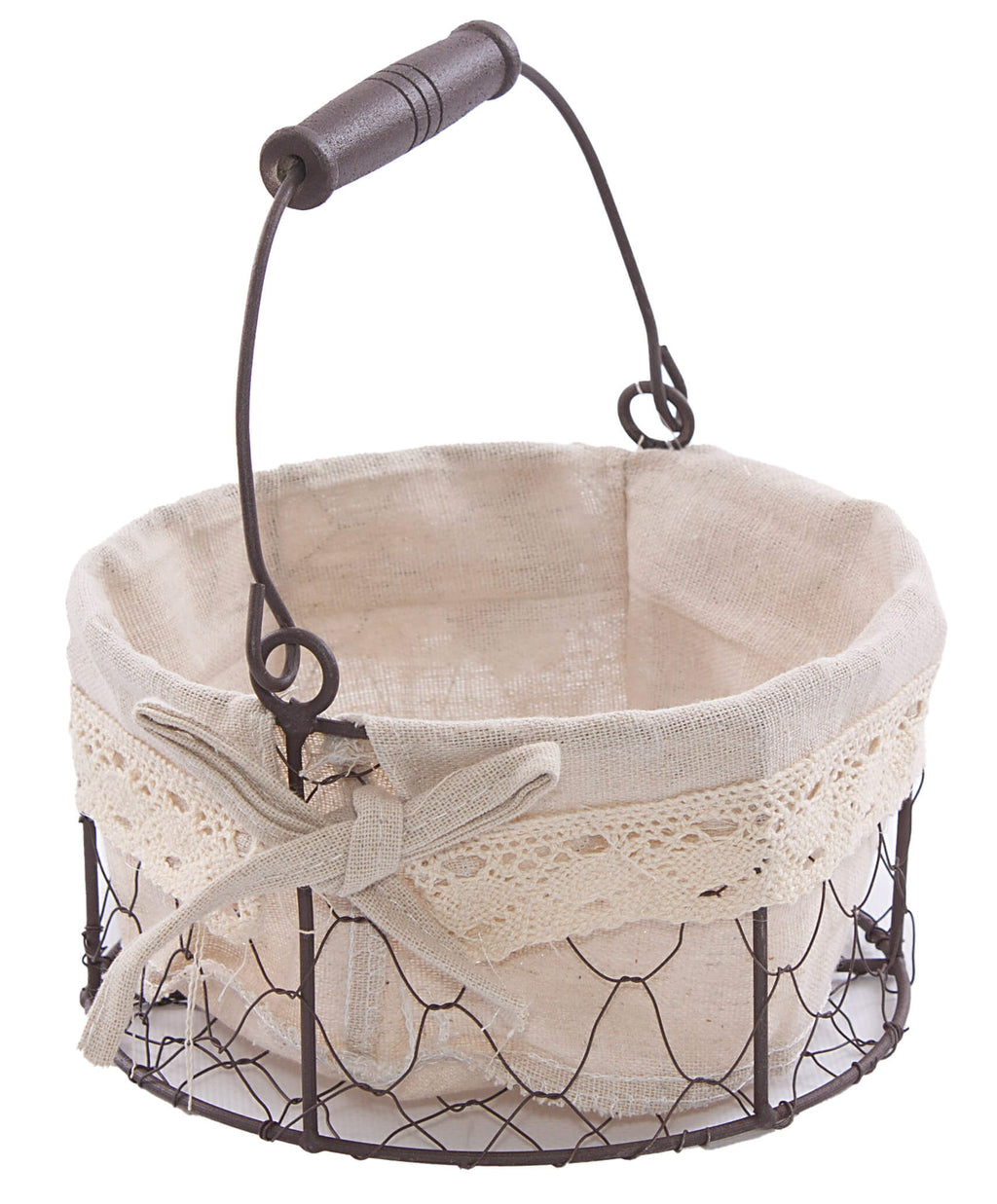 Cesto contenitore rotondo con manico, adatto per il riponimento di piccoli oggetti. La struttura è in metallo realizzato a rete, fodera in cotone color ecrù. Ricrea un'atmosfera romantica e provenzale. La fodera è lavabile.