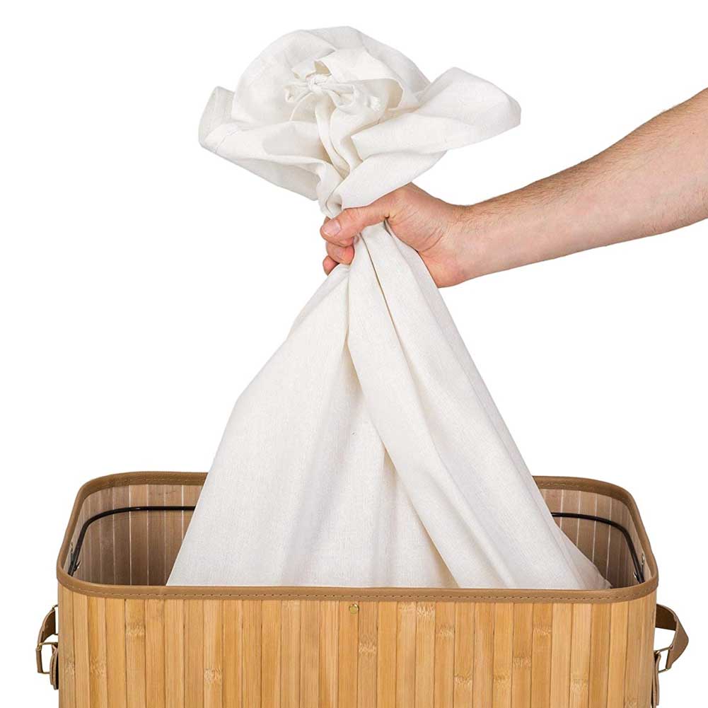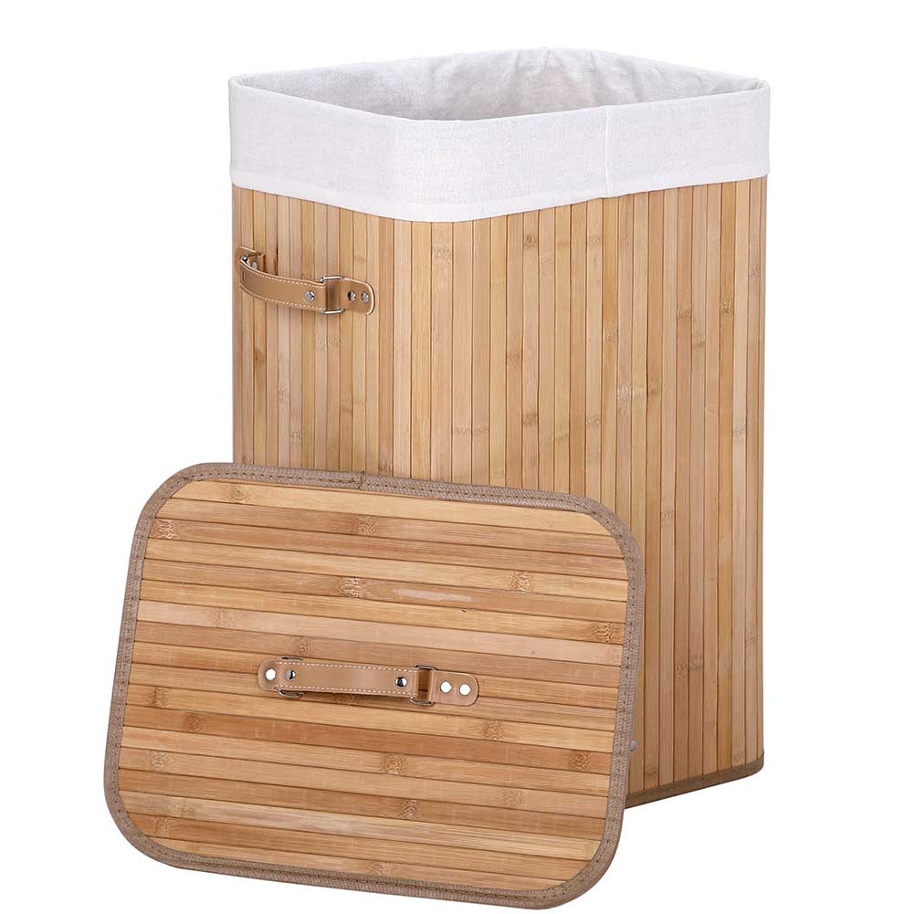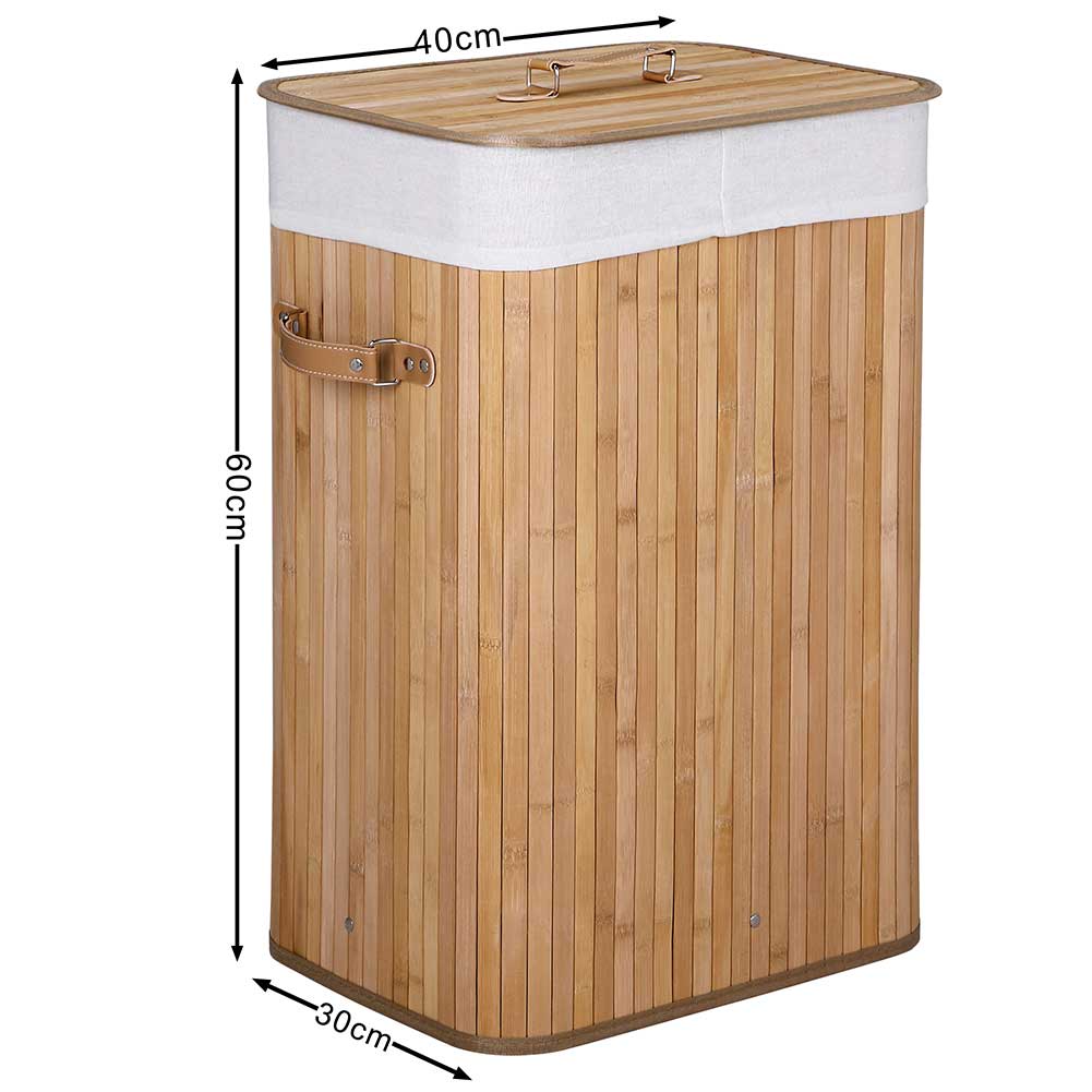 Questo bellissimo cesto portabiancheria è realizzato interamente in legno di Bambù materiale molto resistente e duraturo, all'interno è rivestito con un sacco in tessuto, che non assorbe gli odori sgradevoli della biancheria sporca inoltre può essere rimosso dalla struttura in bambù per essere lavato molto facilmente.