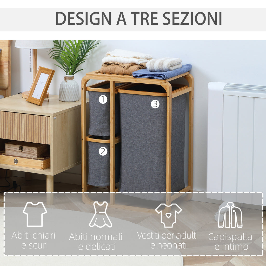 Cesto Portabiancheria 3 Scomparti Estraibili 50x32x69,7 cm in Tessuto e Bambù