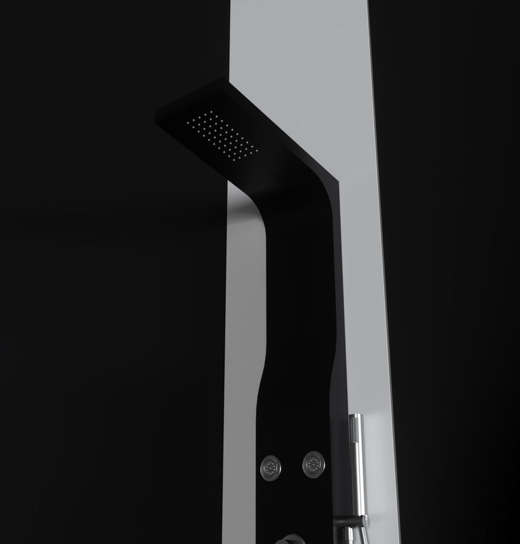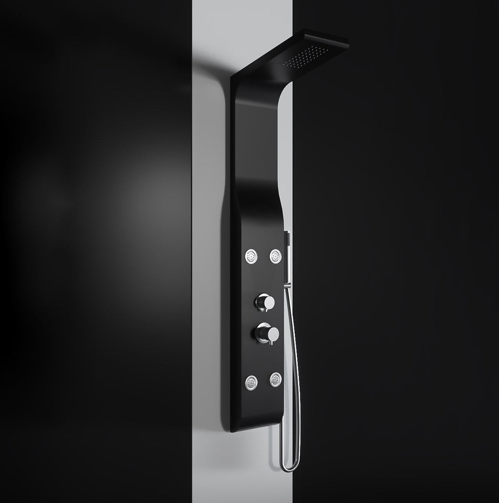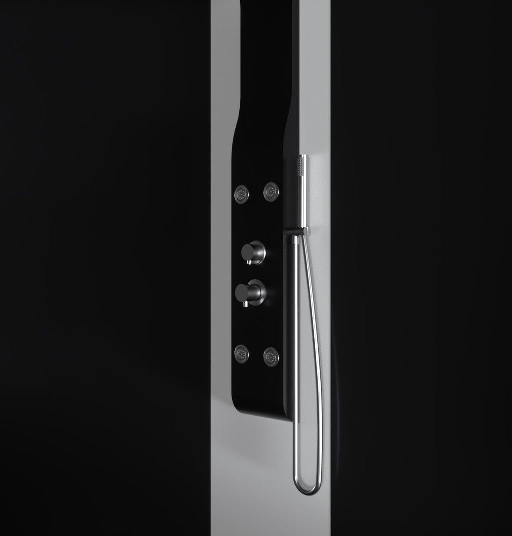 Pannello idromassaggio realizzato in ABS verniciato nero opaco con soffione e getti idromassaggio, la soluzione ideale per gli amanti della doccia in total relax.