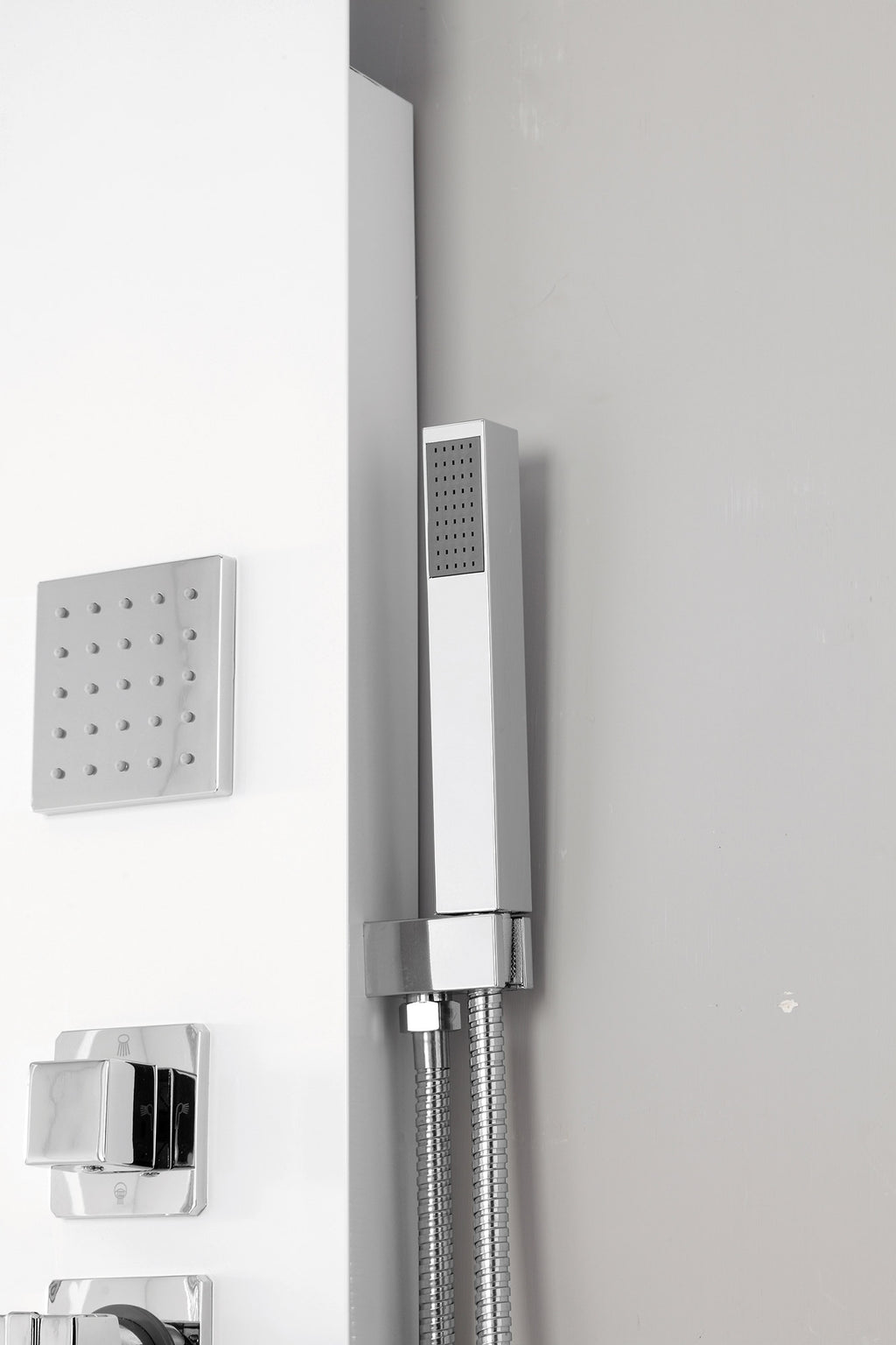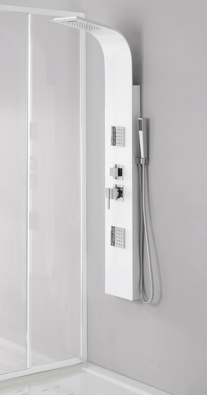 Colonna doccia in alluminio bianco con quattro funzioni selezionabili: Doccetta, Soffione, Effetto cascata, Getto orizzontale massage.