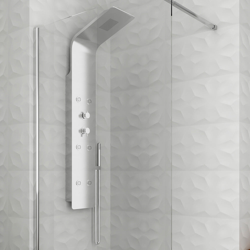 Il design minimale, la maniglia e il taglio squadrato ne fanno il prodotto top di categoria! Il corpo del pannello doccia proposto è realizzato in alluminio verniciato a polvere finitura silver argento satinato, il flessibile ed il doccino sono inclusi, il miscelatore a 3 vie da la possibilità di gestire il getto d'acqua singolarmente su: soffione, doccino e getti idromassaggio.