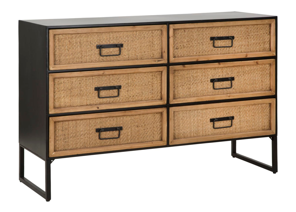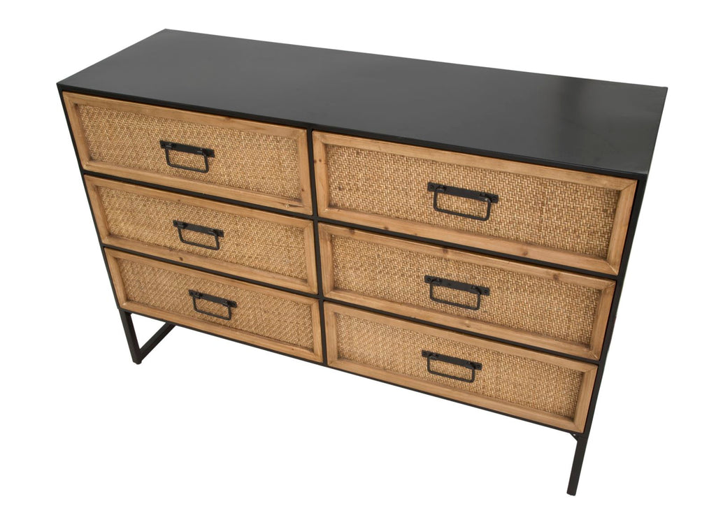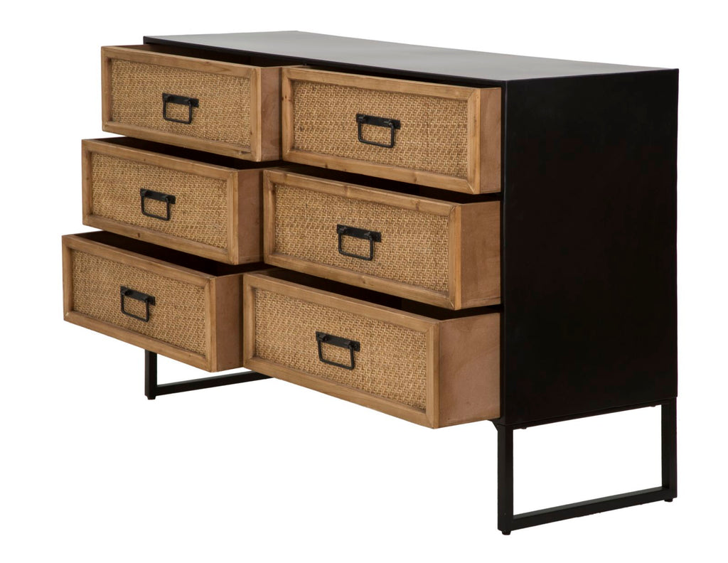 Comò con struttura in metallo nero e 6 cassetti in legno dalla lavorazione che richiama gli intrecci del rattan. Il design semplice e lineare la rende un articolo adatto ad essere abbinato ad ogni tipologia di arredo.