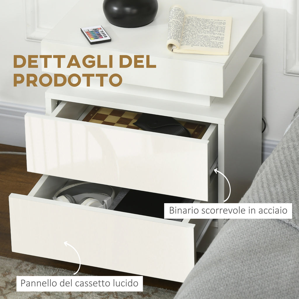 Comodino con LED RGB 45x35x52 cm 2 Cassetti in Truciolato Bianco