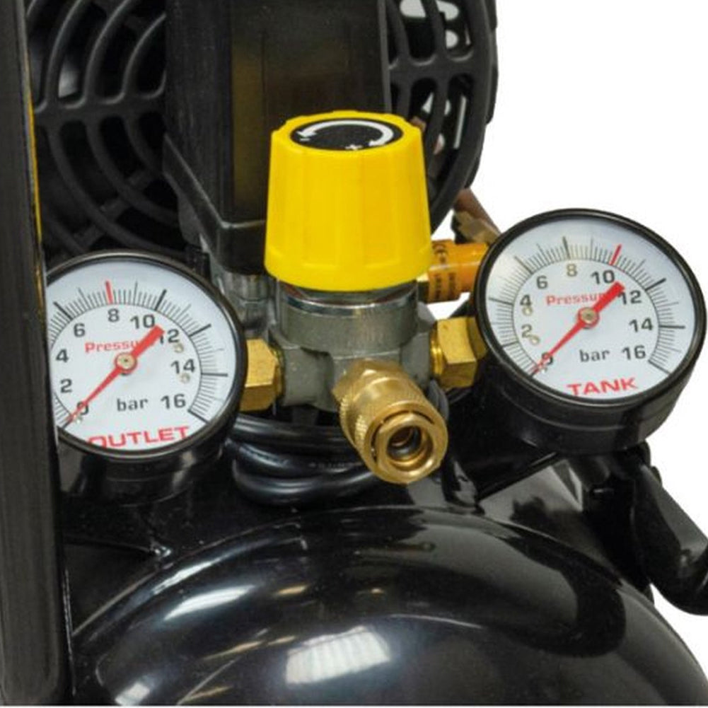 Il compressore ha un motore da 1,5 hp con una velocità di 1440 giri al minuto. La pompa dell'aria produce una pressione di esercizio fino a 8 bar in un serbatoio con una capacità di 24 litri. Puoi impostare facilmente la massima pressione di esercizio sul quadrante sulla parte superiore del compressore. Nella parte inferiore del compressore d'aria troverai due ruote. In combinazione con la maniglia integrata, puoi spostare facilmente ilcompressore al tuo prossimo lavoro.