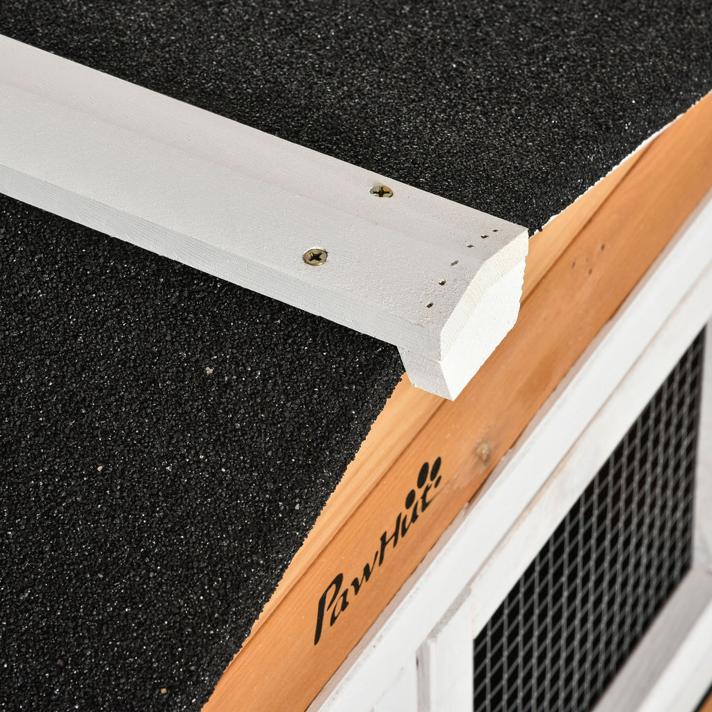 - TETTO IN BITUME: Il tetto in bitume della conigliera da esterno è progettato con forma inclinata per evitare l'accumulo di acqua e i danni che ne conseguono, mantenendo così l'area sempre asciutta e proteggendo gli animali da raggi UV e pioggia