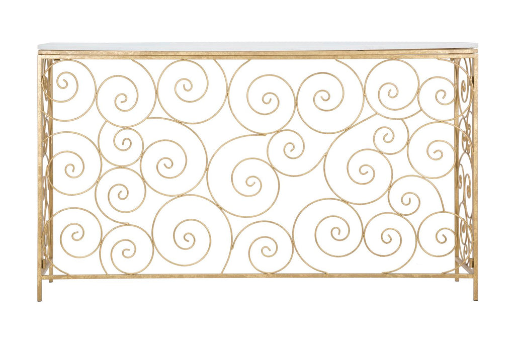 Console rettangolare in metallo dorato impreziosita dal piano in marmo bianco. Le particolari e morbide decorazioni geometriche donano un tocco di ricercatezza ad ogni ambiente.