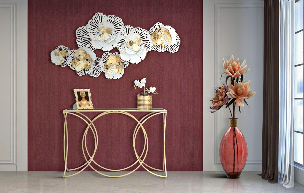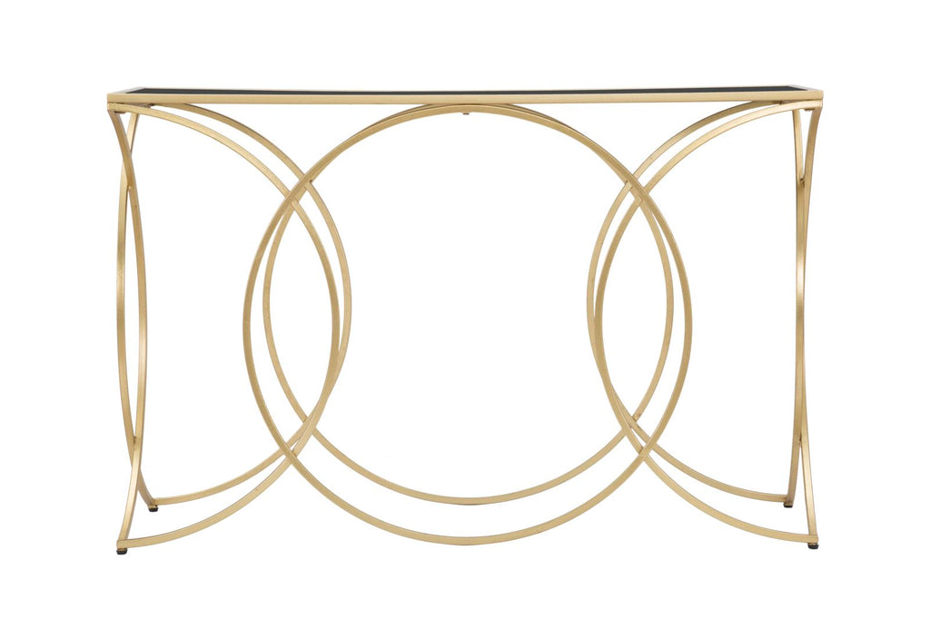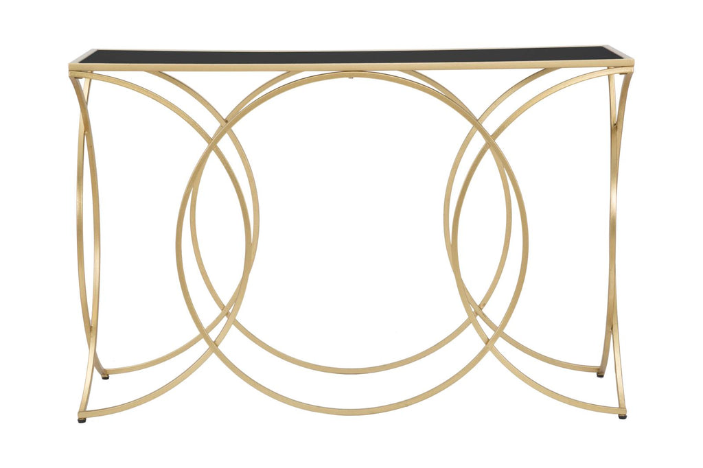 Elegante console in metallo dorato con ripiano in vetro temprato nero. I decori geometrici donano un tocco di classe e luminosità.