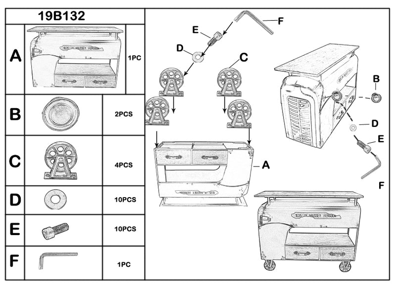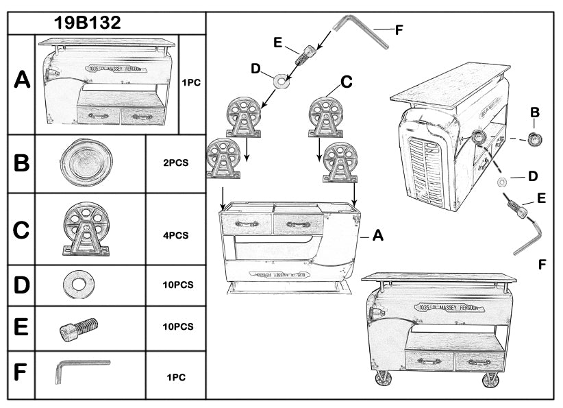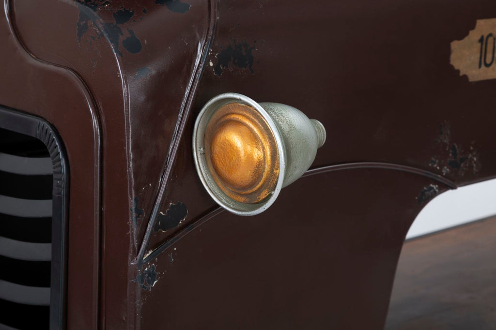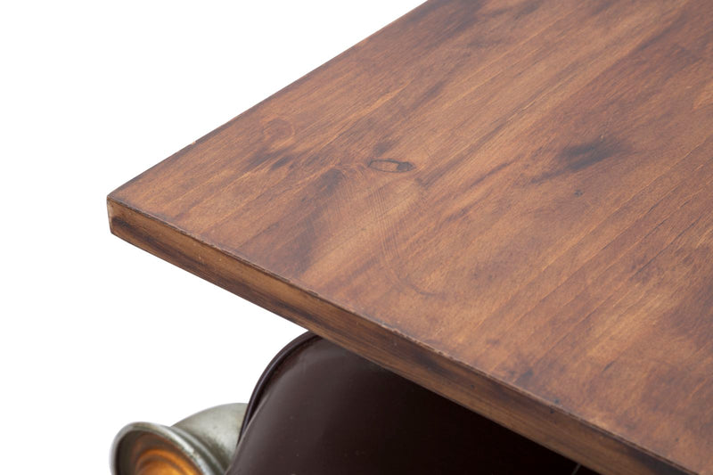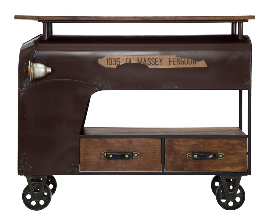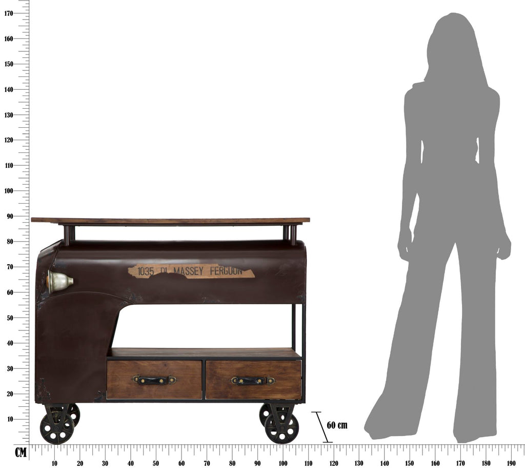 Console in metallo con top in legno, ripiano e 2 cassetti. Il design ricorda le macchine agricole degli anni '60. Un tocco vintage e industriale per creare un ambiente ricercato.