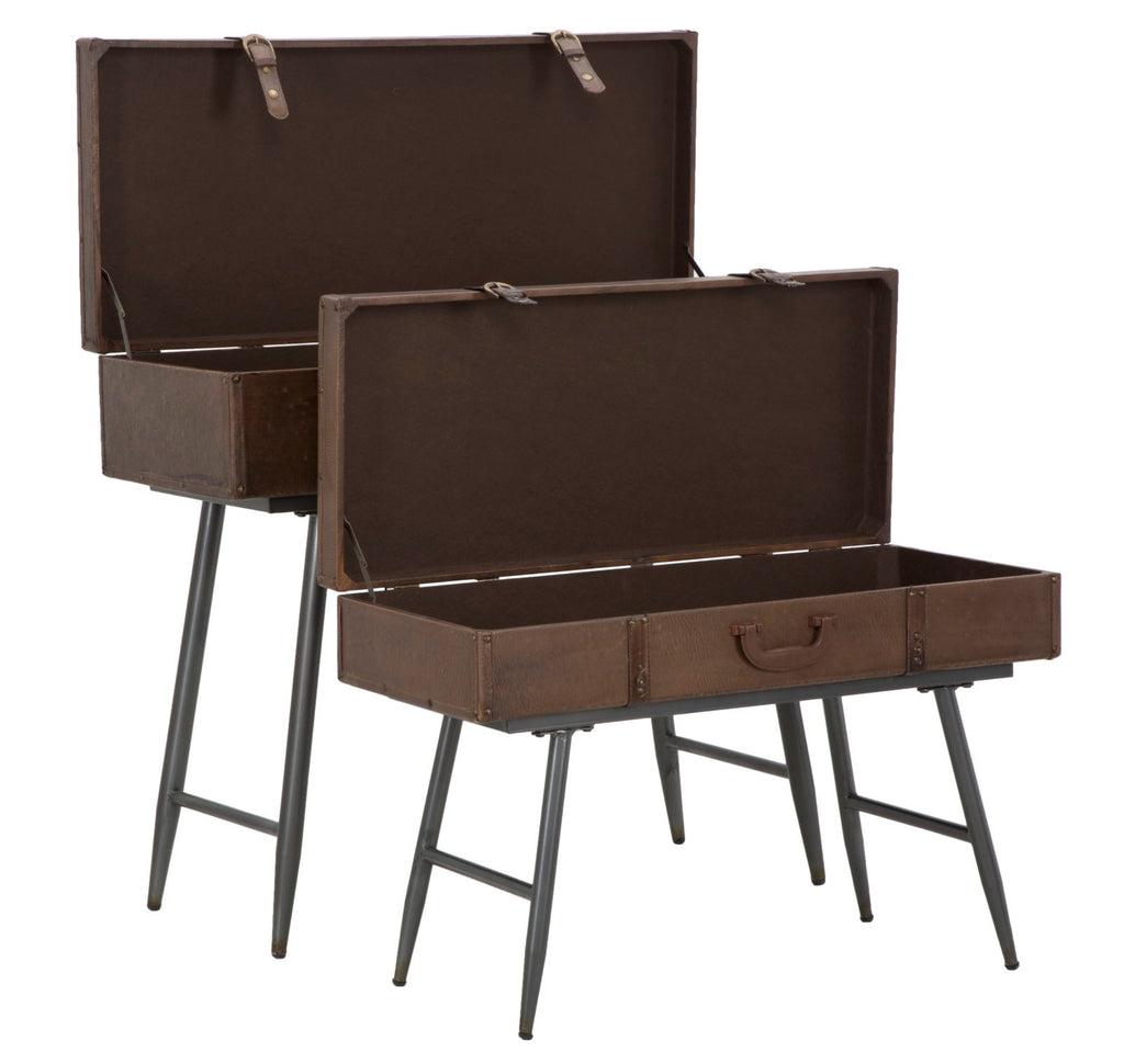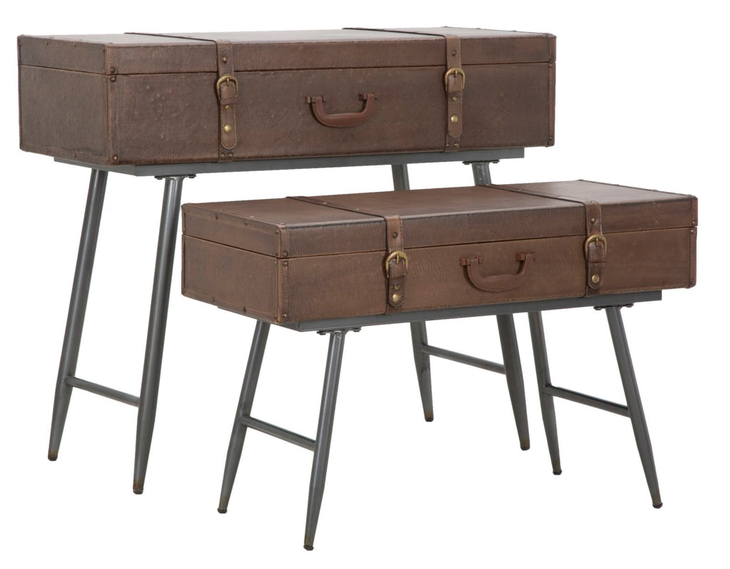 Console Travel Coppia con Contenitore 90x40x78,5-80x35x53,5 cm Legno e Ferro e PU Marrone