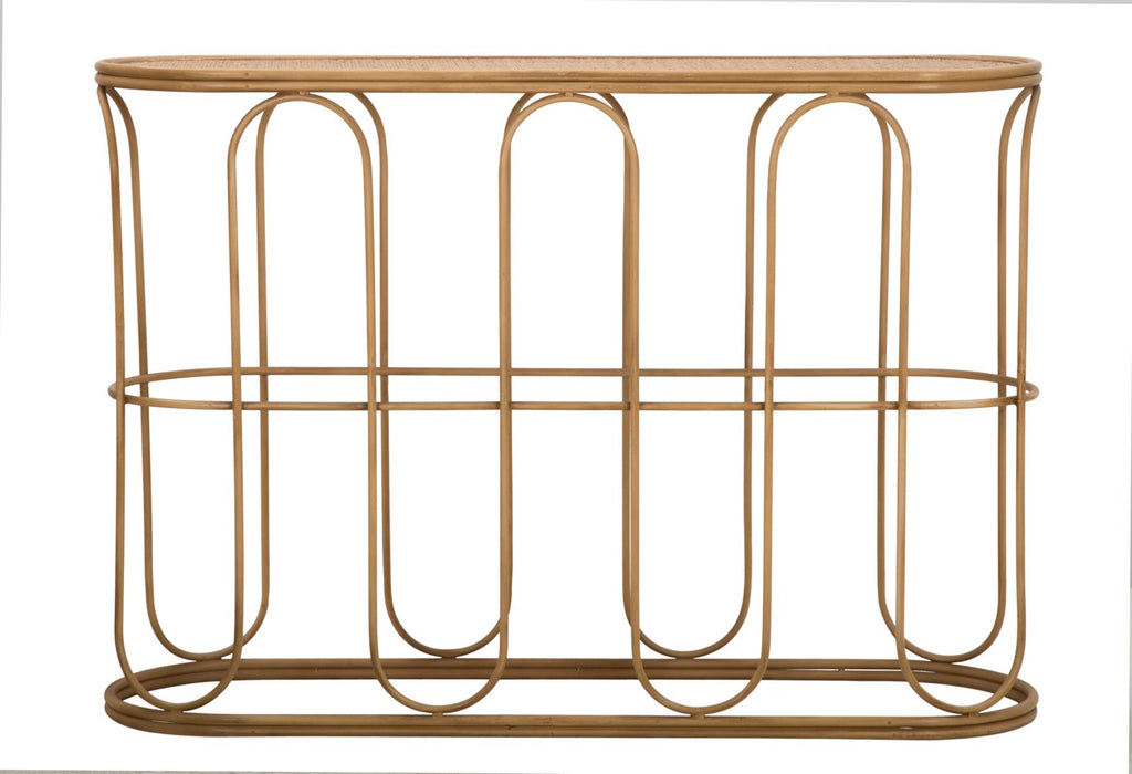 Console con struttura in metallo che ricorda il bamboo e piano in rattan. La forma dei lati corti arrotondati e la lavorazione della struttura composta da linee morbide e avvolgenti donano un tocco di calore ad ogni ambiente.