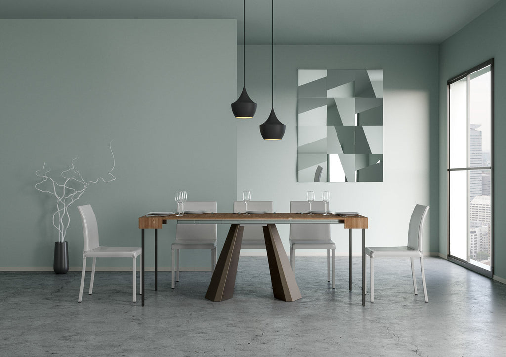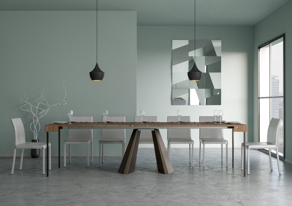 Consolle Diamante, un Tavolo Consolle ricercato per arredare con gusto e design la tua casa. La linea originale rende la Consolle perfettamente adattabile al mobilio di casa, che sia in stile classico o moderno.Ciò che contraddistingue la Consolle Diamante è la praticità con la quale sarà possibile trasformarla da semplice e lineare Consolle a comodo e utile tavolo da pranzo.La Consolle Diamante potrete collocarla in cucina, in sala da pranzo o in soggiorno, potrà essere interessante come punto di appoggio non appena si entra in casa se posta in ingresso e perché no, con sopra uno specchio e vicino a un vaso di fiori.La funzionalità e la versatilità la si riscontra proprio nella possibilità di allungare Consolle Diamante per ospitare amici e parenti nei momenti più importanti da condividere.Con il sistema di allunghe, in poche e semplici mosse trasformerete la piccola Consolle in un ampio tavolo da pranzo: stabile, resistente e robusto. La solidità della struttura il ferro con il piano lavorato a Folding, in Abete listellare, rende la Consolle robusta e stabile. Interamente made in Italy La Consolle di serie viene fornita con un sostegno centrale a due appoggiaterra che ne garantisce la propria funzionalità.
