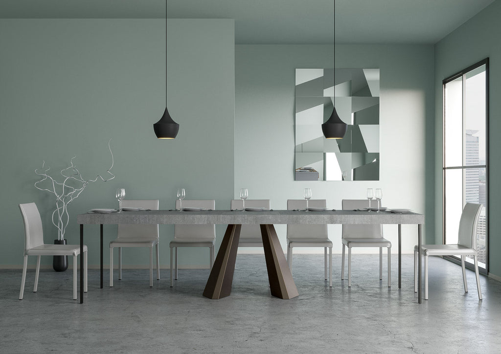 Consolle Allungabile Diamante Premium con allunghe a Folding. Una Consolle estremamente stabile, robusta, elegante e dal design originale. Tavolo originale e di grande impatto.Dalle linee pulite e di grande impatto, i due materiali impiegati si fondono in un'armoniosa combinazione. Composta essenzialmente da due parti: la struttura portante in metallo verniciato il piano superiore allungabile con sistema di guide in alluminio ad elevata scorrevolezza. Spazioso e robusto, il piano è supportato da due sistemi di appoggio che andranno inseriti alle estremità mediante appositi meccanismi di bloccaggio. La Consolle Diamante può in un attimo trasformarsi in un piano di 3 metri nelle occasioni più importanti.