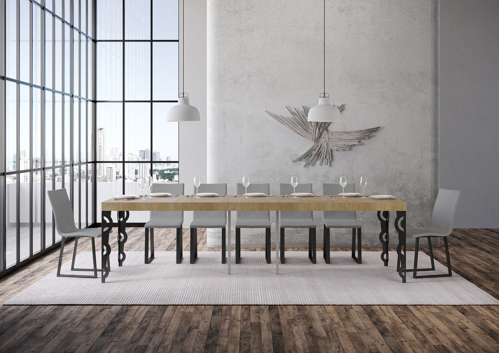 Consolle Karamay Premium con allunghe a Folding è una linea morbida e sinuosa per una Consolle di carattere, capace di arredare con personalità qualunque ambiente. Piccola e compatta da chiusa, è dotata di un sistema a cinque allunghe che le permette di estendersi progressivamente fino a 300 cm, trasformandosi all'occorrenza in un pratico tavolo da pranzo da 14 posti. Disponibile nella versione Premium, con particolari allunghe di tipo Folding, una lavorazione di alta qualità che permetta, a Consolle aperta, di nascondere alla vista e coprire parte del telaio che altrimenti rimarrebbe scoperto, garantendo un risultato estetico di notevole impatto. Le allunghe sono nella stessa finitura del piano. Il robusto telaio in metallo lavorato a laser ad alta precisione, costituisce la struttura portante della Consolle stessa, garantendo stabilità e affidabilità anche alla sua massima estensione. Il telaio in ferro è disponibile nella versione verniciata. Realizzata interamente in Italia mediante l'utilizzo di materiali 100% italiani.