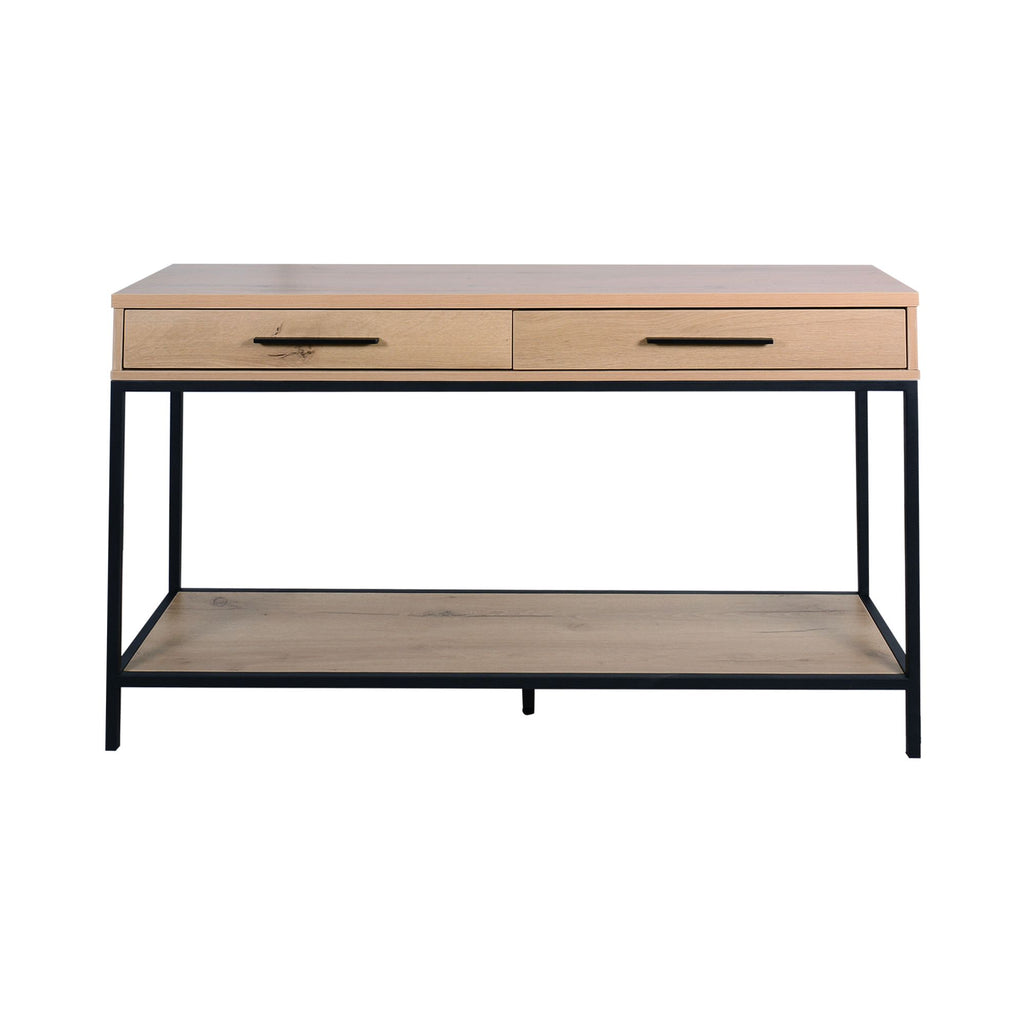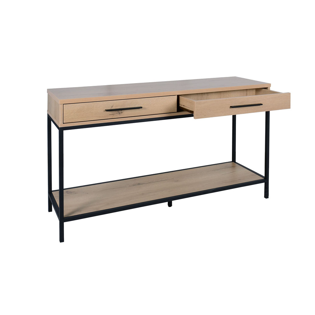 Consolle con 2 cassetti disponibile nella colorazione legno rovere con struttura e maniglie in metallo nero. Dimensioni 130 x 39.5 x 79.5 cm