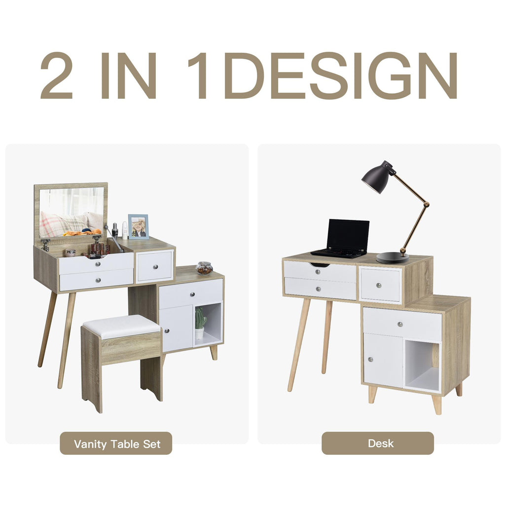 Questa toletta chic è un'ottima aggiunta alla vostra camera da letto, con uno specchio scorrevole e uno sgabello imbottito. È dotato di 3 cassetti e 1 armadietto ad ante con ripiano regolabile all'interno e 1 ripiano aperto per mantenere i gioielli e cosmetici in ordine. Lo sgabello è dotato di un cuscino che lo rende confortevole. Il tavolo è realizzato con pannello truciolare e le gambe sono in legno di pino per una maggiore resistenza. Questo set da toletta è elegante ed adatta a qualsiasi arredamento della stanza.