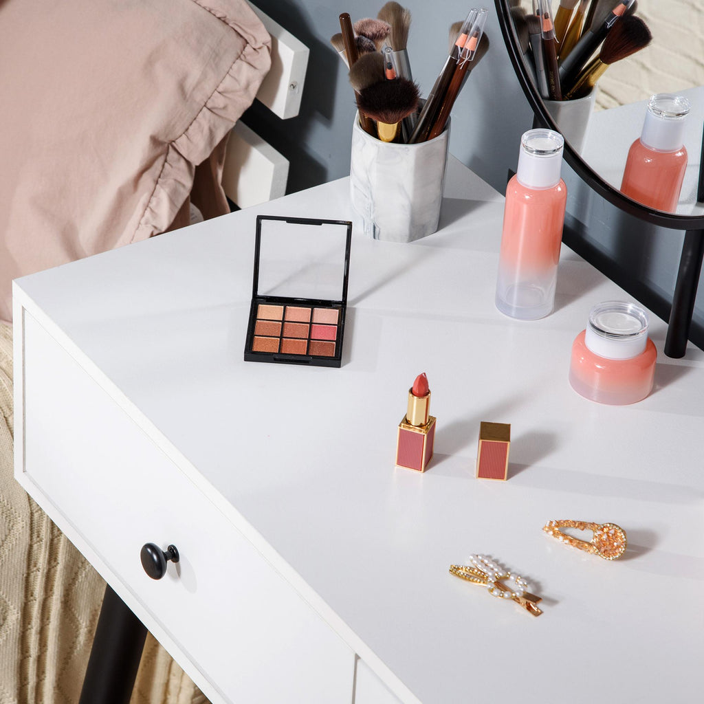 - TANTO SPAZIO PER RIPORRE: Questo tavolo per trucco ha un ampio piano d'appoggio, 3 mensole e 2 cassetti, che ti offrono tutto lo spazio di cui hai bisogno per tenere in ordine trucchi e accessori di bellezza.