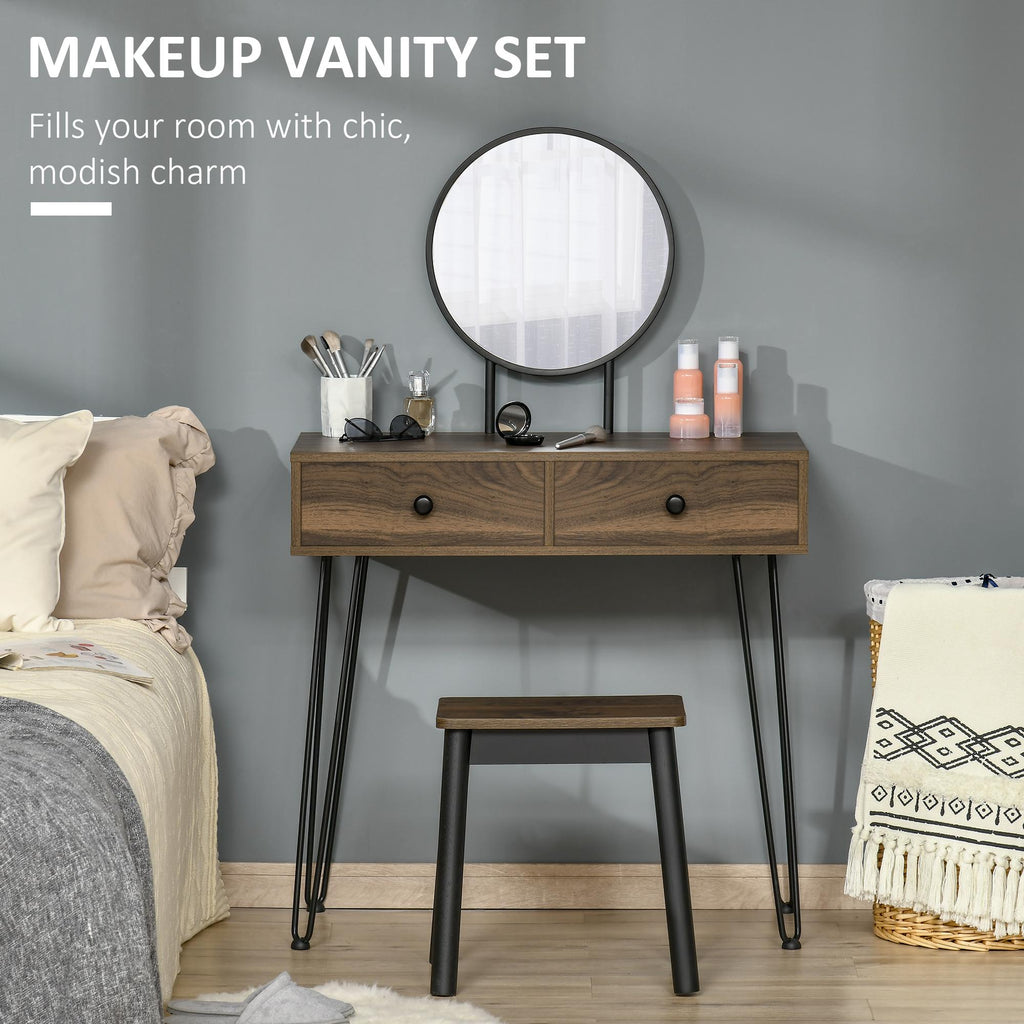 Consolle Trucco con Specchio e Sgabello in Legno e Metallo Color Noce