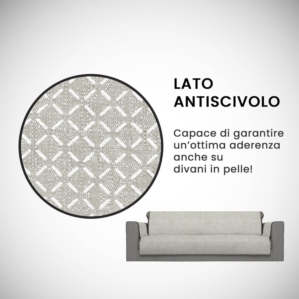 Copridivano antiscivolo, dotato di parte inferiore in gomma antiscivolo, in modo da fare aderire perfettamente l'articolo al divano. Articolo resistente, adattabile a tutte le tipologie di divano specialmente a quelli in pelle, dove i normali copridivani tendono a scivolare. Articolo Made in Italy. Articolo prodotto artigianalmente. Ogni capo potrebbe presentare una leggera differenza di colore, data dall'intreccio manifatturiero dei filati.