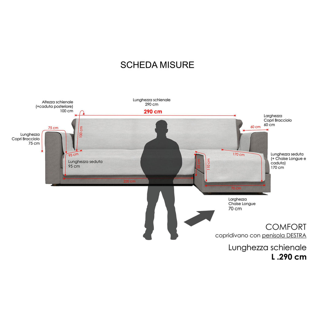 Copridivano antiscivolo Comfort, dotato di parte inferiore in gomma antiscivolo, in modo da fare aderire perfettamente larticolo al divano. Articolo resistente, adattabile a tutte le tipologie di divano specialmente a quelli in pelle, dove i normali copridivani tendono a scivolare. Articolo provvisto di penisola a destra guardando larticolo da di fronte. Articolo prodotto artigianalmente, ogni capo potrebbe presentare una leggera differenza di colore, data dallintreccio manifatturiero dei filati. Articolo Made in Italy.