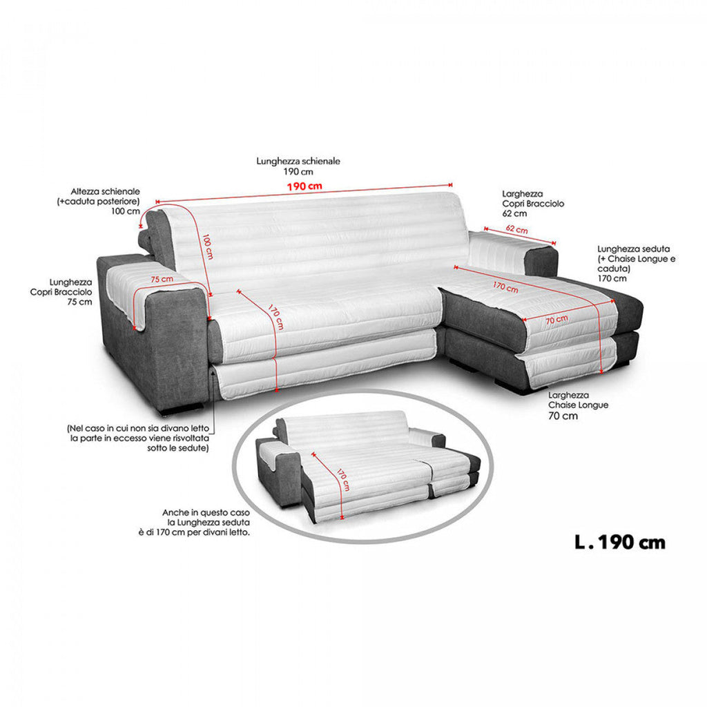 Copridivano Trapuntato in Microfibra anallergica con Penisola Sinistra. Praticissimo copridivano adattabile a qualsiasi divano con penisola sinistra, realizzato in pregiati tessuti d'arredamento con rifiniture accurate e misure abbondanti che fanno di questo prodotto un capo prestigioso trasformando in un solo gesto l'atmosfera del Vostro salotto rendendolo più elegante e accogliente. Trapuntato a canna diritta con distanza di 7 cm tra una cucitura e l'altra per renderlo sottile ma allo stesso tempo morbido. Studiato, assemblato e cucito interamente in Italia.