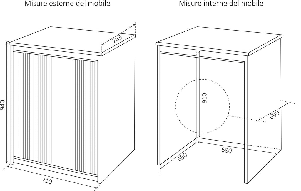 - Spazio interno disponibile per la lavatrice (LxAxP): 68 x 91 x 65 cm