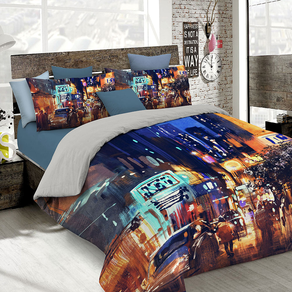 Set copripiumino stampato in digitale composto da sacco piumino e federe. Ideale per chi vuole vestire il proprio letto con immagni originali e uniche. Questa collezione è rappresentata da prodotti di altissima qualità caratterizzati da Stampe in digitale su tessuti cotone 100% che risaltano ogni particolare dell'immagine che si presenta brillante, definita e sopratutta solida ai lavaggi. Studiato, assemblato e cucito interamente in Italia, la stampa è posizionata al centro del sacco e delle federe.