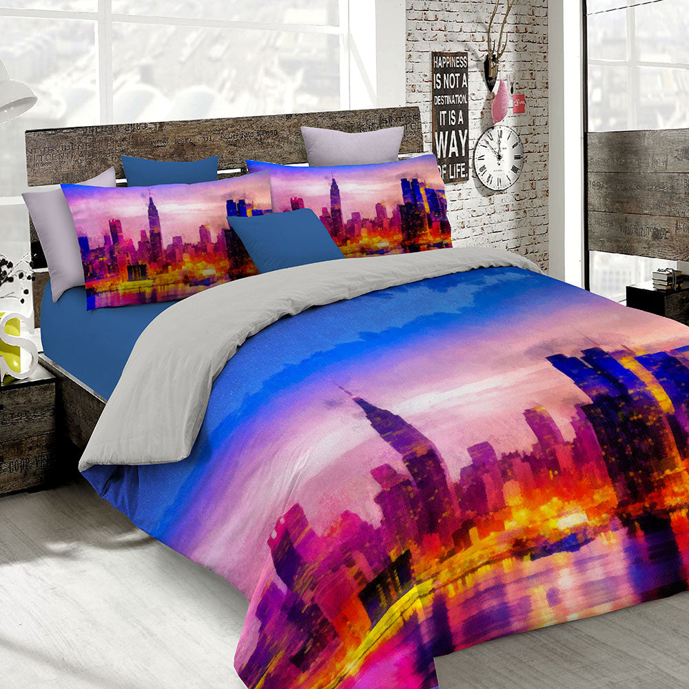 Set copripiumino stampato in digitale composto da sacco piumino e federe. Ideale per chi vuole vestire il proprio letto con immagni originali e uniche. Questa collezione è rappresentata da prodotti di altissima qualità caratterizzati da Stampe in digitale su tessuti cotone 100% che risaltano ogni particolare dell'immagine che si presenta brillante, definita e sopratutta solida ai lavaggi. Studiato, assemblato e cucito interamente in Italia, la stampa è posizionata al centro del sacco e delle federe.