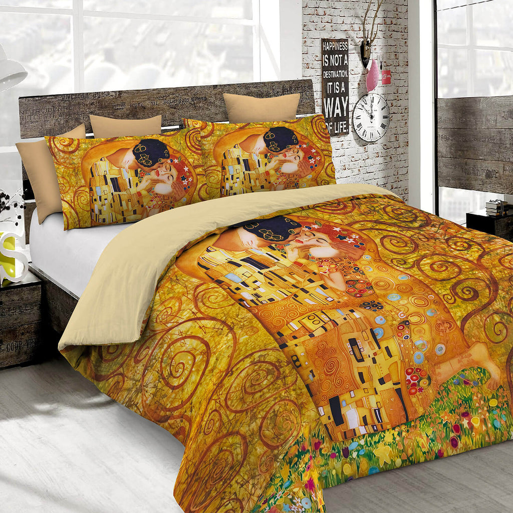 Parure copripiumino Arte con stampa digitale a copertura totale. Articolo provvisto di sacco copripiumino e federe in microfibra con colori brillanti e solidi ai lavaggi. Prodotto Made in Italy.