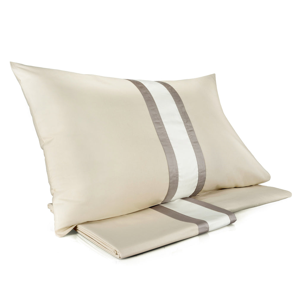 Dalla tinta elegante che valorizza la brillantezza della finissima appplicazione in raso che crea un elegante contrasto con il cotone per un letto dal gusto moderno e mai banale.