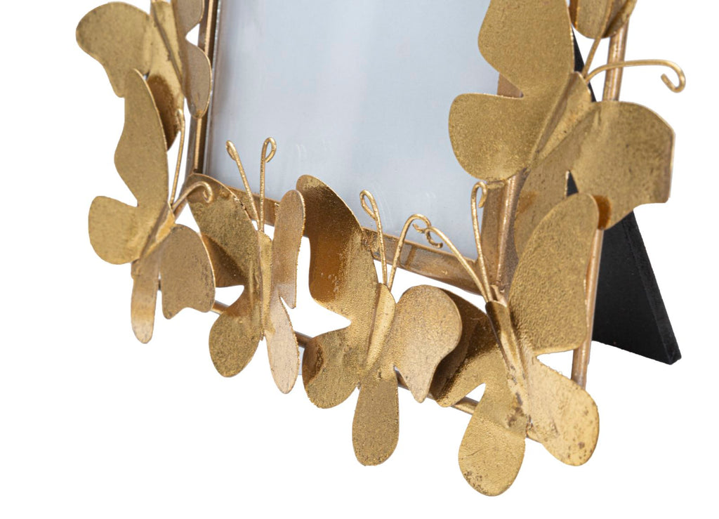 Elegante cornice portafoto in metallo dorato impreziosita da farfalle. Un tocco glam che dona luminosità ad ogni stanza.