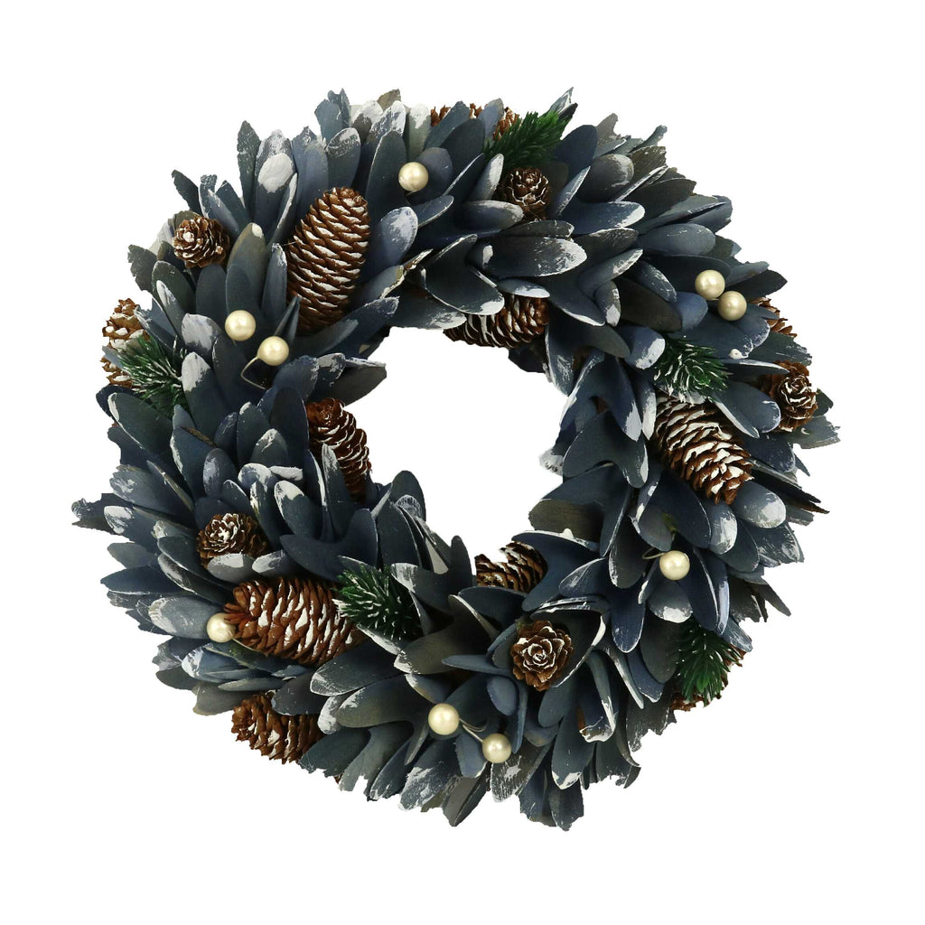 Coroncina innevata con pigne e foglie blu cm Ø30xh8,5