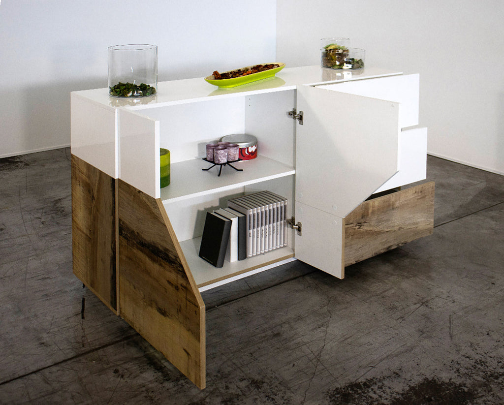 La credenza ALIEN da 141 cm realizzata con un design unico 100% Made in Italy, è caratterizzata da 2 grandi ante con elementi diagonali, un ampio ripiano interno in legno e 3 cassetti con guide in metallo. La credenza riesce ad adattar si a qual sia si tipo di ambiente e con il suo semplice kit di montaggio ti permetterà, in poco tempo, di avere un mobile unico in grado di arricchire lo spazio in cui vorrai inserirlo.