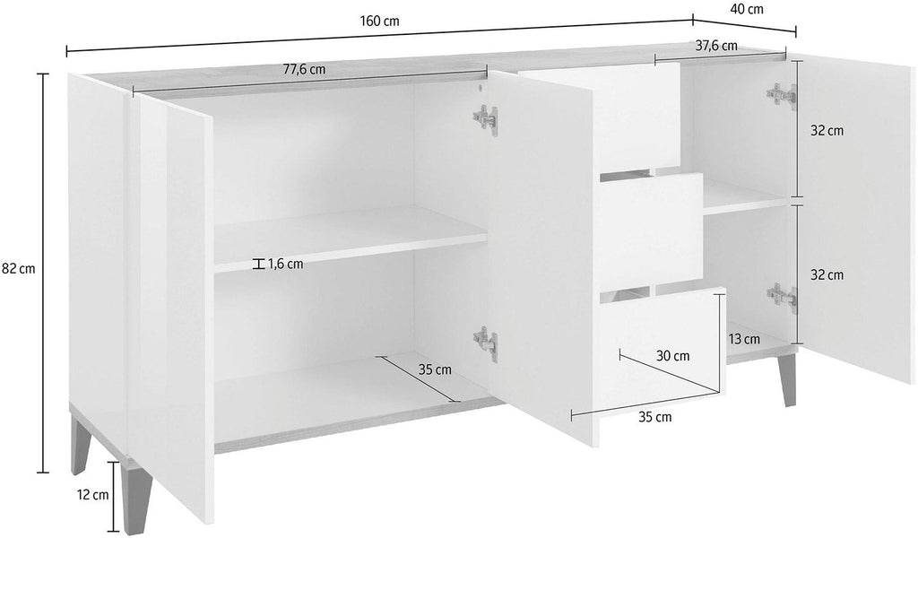 La credenza SUNRISE 3 ante + 3 cassetti da 160 cm piace per le sue dimensioni e il suo design unico e inconfondibile. Le 3 ante sono composte da 2 ripiani in legno e i 3 cassetti sono caratterizzati da guide in metallo. La credenza si appoggia su quattro piedini piramidali in plastica nera dell’altezza di 10 cm. La forma lineare la rende perfetta per qual sia si stile di arredamento.