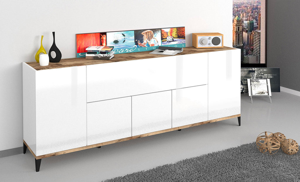 La credenza SUNRISE 4 ante + 1 anta ribalta da 200 cm, grazie alle sue dimensioni e a un design unico, riesce a essere perfetta in ogni tipo di ambiente. È caratterizzata da 4 ante e 1 anta ribalta. La credenza è sostenuta da sei piedini in plastica nera dalla forma pirami dalee dall'altezza di 10 centimetri. Con la sua forma lineare la credenza SUNRISE risulta elegante in qual sia si stile venga inserita. Il kit di montaggio comprende istruzioni semplici e dettagliate.
