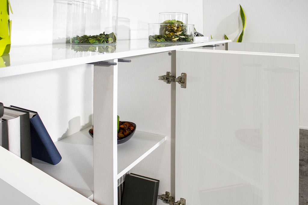 La credenza Bloom da 180 cm si distingue per le sue dimensioni e il suo design inconfondibile. La struttura è composta da 4 ante a battente con apertura push to open e, all’interno, 2 ripiani in legno. La parte frontale e la struttura sono realizzati in melamina laccata bianca o antracite lucida. È possibile inserire la credenza BLOOM da 180 cm in qual sia si ambiente. La sua versatilità, infatti, la rende un complemento d’arredo funzionale e senza tempo.