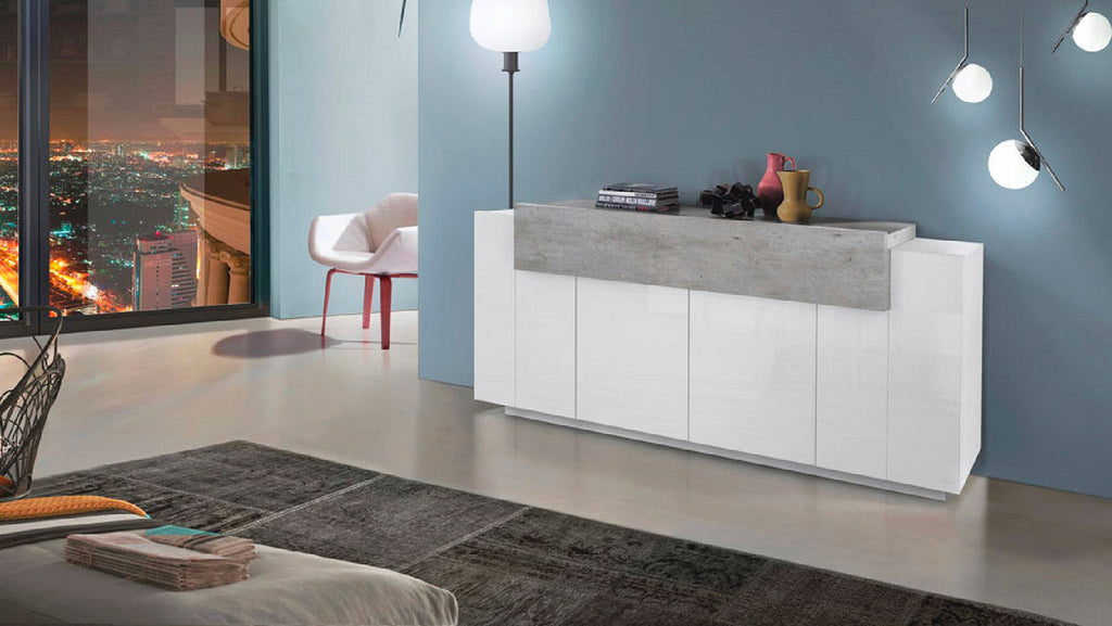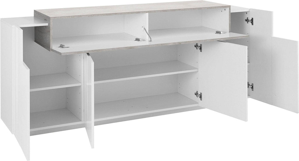Credenza 4 Ante Battenti + 1 Anta a Ribalta 200x45x85,5 cm Coro Bianco Lucido e Cemento