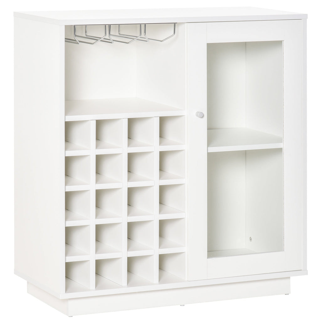 Brinda a questo mobile porta bottiglie semplice ed elegante, perfetto per gli amanti del vino che vogliono tenere in ordine bottiglie e bicchieri. Grazie ai binari porta calice, un portabottiglie per 20 vini e un armadietto con anta in vetro, hai tutto lo spazio che serve per tenere in ordine in modo organizzato. Realizzato con pannelli di truciolare, è resistente e stabile, e dotato di cinghie antiribaltamento per una stabilità ottimale. Design moderno ed elegante con finitura bianca. Credenza moderna dotata di portabicchieri superiore, portabottiglie da 20 vani e armadietto laterale. Anta in vetro elegante per proteggere gli oggetti dalla polvere. Piano superiore piatto per ulteriore spazio di appoggio. Struttura del mobile cucina in truciolare resistente, liscio e facile da montare. Cinghie anti-ribaltamento per evitare il rischio di caduta accidentale. Carico massimo 50 kg.