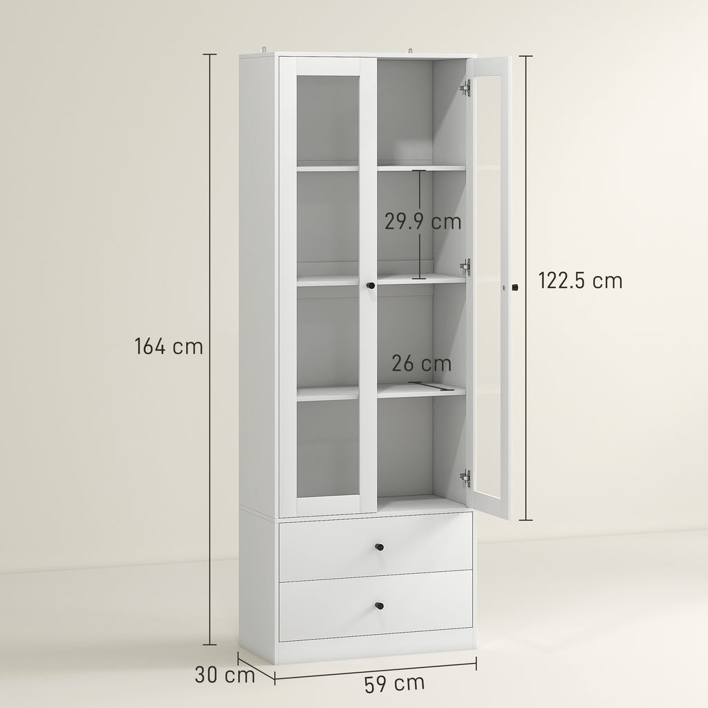 Credenza Cucina 59x30x164 cm Ante in Vetro e 2 Cassetti Bianco