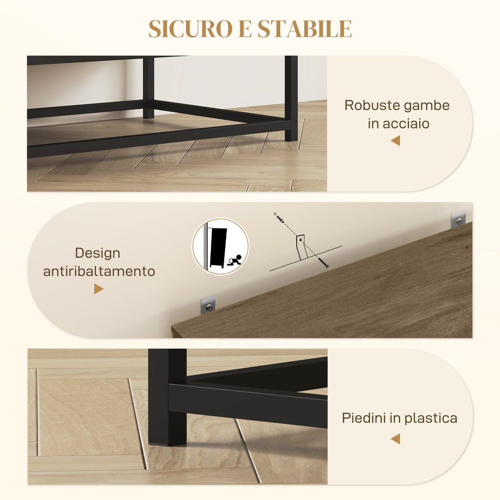 Credenza soggiorno a 2 ripiani con ripiano regolabile per avere sempre lo spazio giusto per gli utensili. Pannello in venatura del legno naturale abbinato a maniglie nere. Credenza da soggiorno in truciolato e base in acciaio verniciato a polvere per garantire una lunga durata d'utilizzo. Il design antiribaltamento e i piedini in plastica della credenza moderna migliorano la sicurezza. Mobile contenitore utilizzabile in cucina, soggiorno e ingresso. Montaggio richiesto.