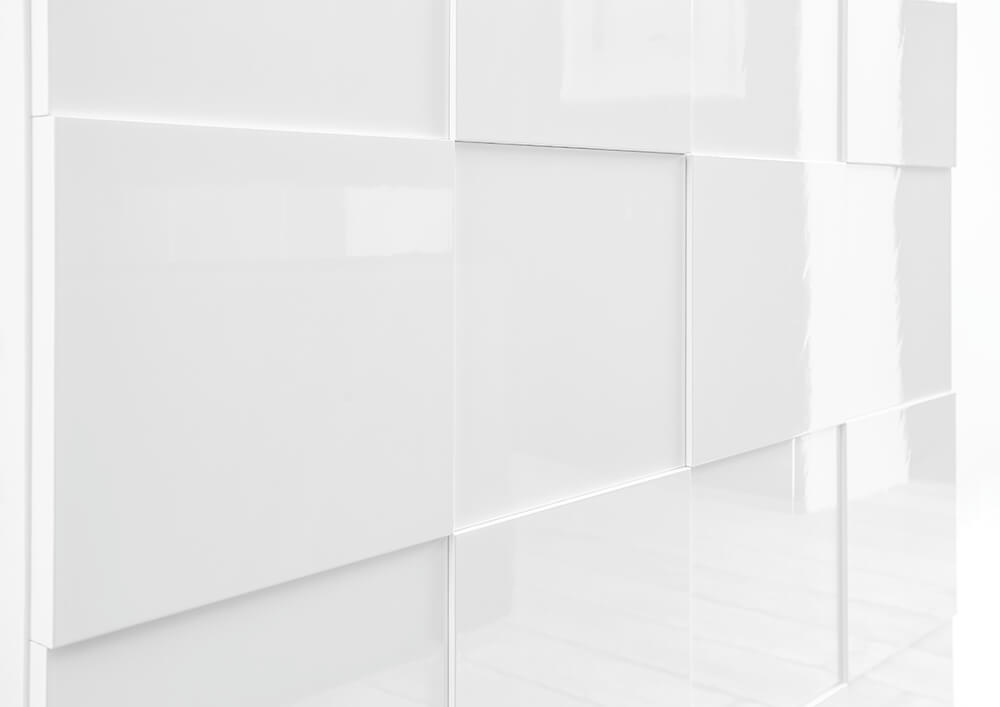 Credenza Mobile Soggiorno Con 2 Porte 4 Cassetti e Vetrina Centrale In Melamina 241x42x84cm TFT Chequers Bianco Lucido
