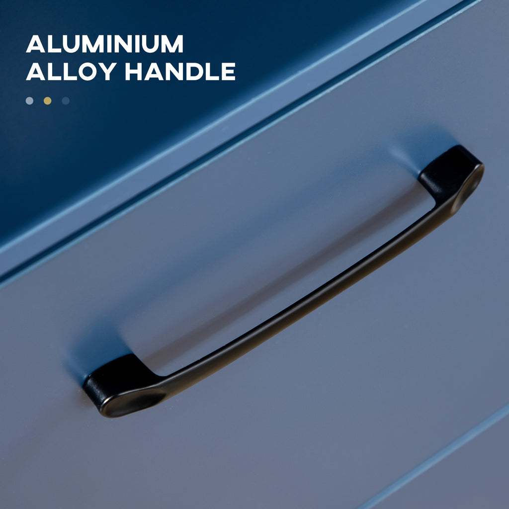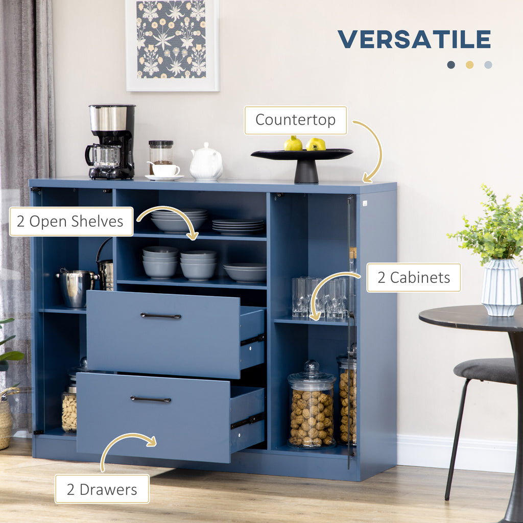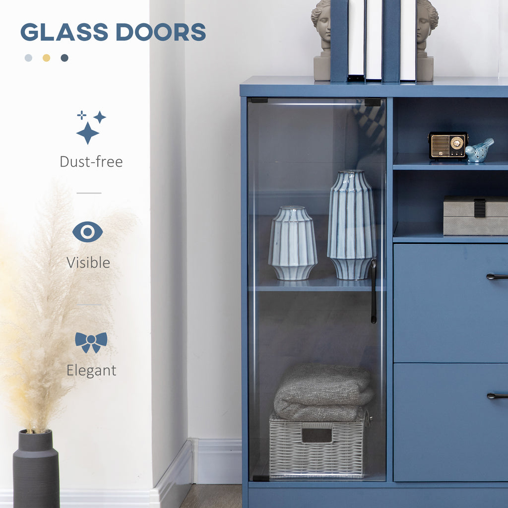 La credenza moderna è l'arredo che manca nella tua casa, per aggiungere un tocco di eleganza e offrirti tanto spazio. Con due armadietti, due cassetti e due vani aperti, questo mobile buffet è perfetto per riporre stoviglie, provviste e tanto altro. Le due ante in vetro e la finitura blu scuro creano un effetto moderno e chic, per dare un nuovo aspetto alla tua cucina e al soggiorno.