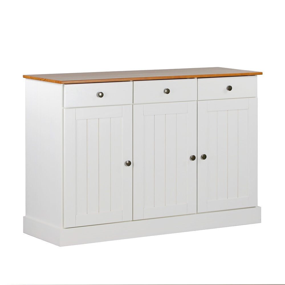 Riscopri il fascino dello stile vintage con la credenza a 3 ante e 3 cassetti bianca Provenza! La struttura in legno massello bianco e il top in finitura naturale, conferiscono un'aria campestre a qualsiasi soggiorno. Con i vani portaoggetti, potrai sistemare accuratamente la biancheria o le stoviglie e nei 3 cassetti posate e altri oggetti.