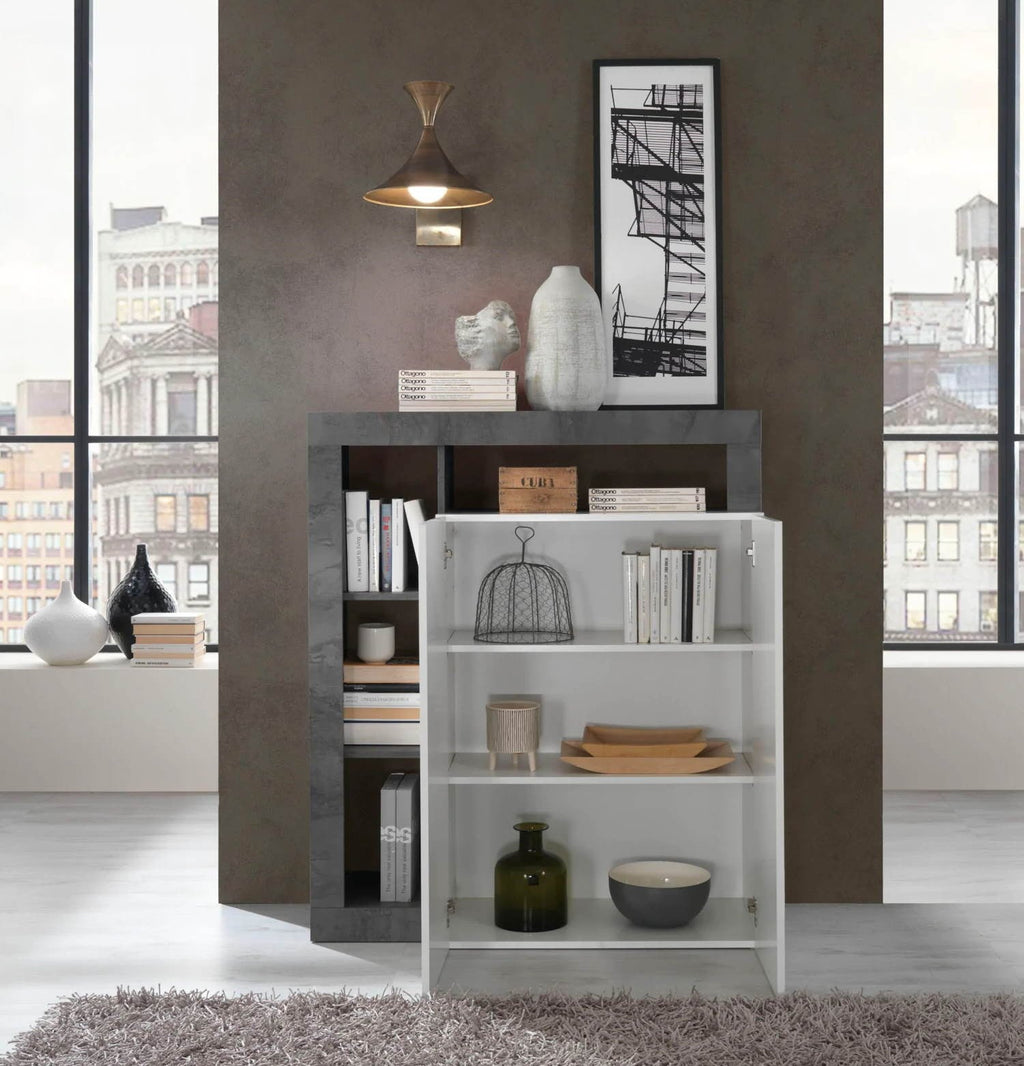Due ante battenti con due ripiani interni, Il binomio cromatico la rende di facile abbinamento ad ambienti moderni ed eleganti.