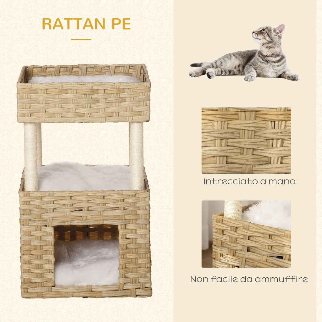 La casetta per gatti su 3 livelli offre ai tuoi animali tutto lo spazio di cui hanno bisogno per riposare. È composta da una casetta inferiore e 2 piattaforme superiori, e ogni livello è dotato di un morbido cuscino che assicura sonnellini confortevoli. La cuccetta per gatti è rivestita in rattan PE resistente ai graffi dei gatti, per soddisfare il loro istinto di affilarsi le unghie.