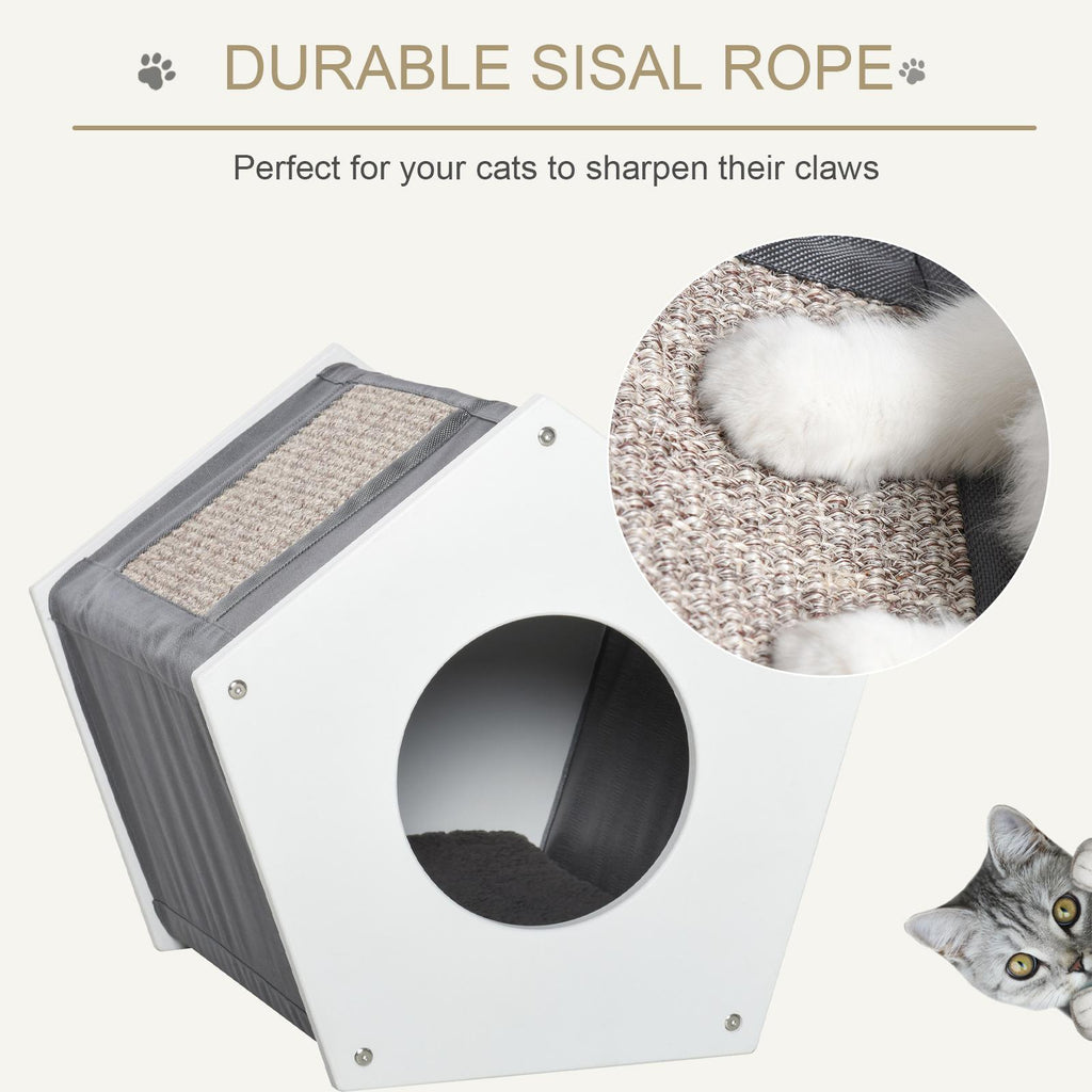Asseconda l'istinto naturale dei felini di nascondersi e farsi le unghie con questa casetta per gatti. Grazie all'imbottitura interna e alla struttura chiusa i gatti possono trovare un ambiente confortevole e in cui si sentono sicuri per schiacciare un pisolino. I tuoi gatti non avranno bisogno di andare lontano per affilarsi le unghie perché la casetta è dotata di tiragraffi in sisal sul tetto. Regala questa cuccia per gatti ai tuoi piccoli amici, ha un look semplice ed elegante che si abbina perfettamente a ogni stanza.