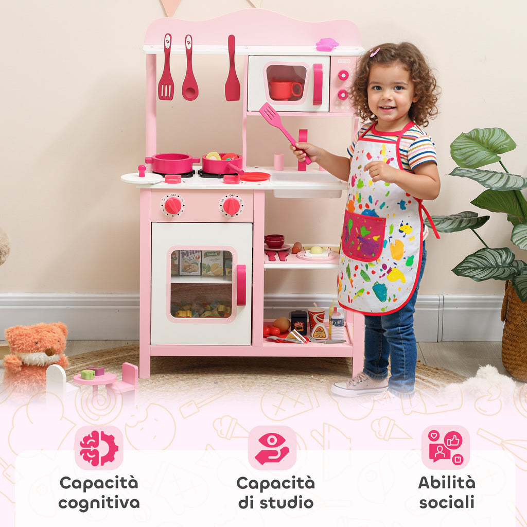 Cucina Giocattolo per Bambini 3+ Anni 55x24x86 cm con Microonde Piano Cottura e Lavandino in Legno Rosa